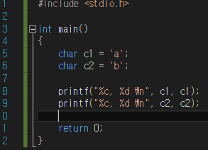 만약, 서식지정자 %d로 출력하게 되면 char변수에 저장된 정숫값(ASCII 코드값)이 출력된다.