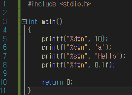 위 소스코드에서 10, 'a', "Hello", 0.1f 처럼 값을 그대로 입력한것이 리터럴이다. 순서대로 정수 리터럴, 문자 리터럴, 문자열 리터럴, 실수 리터럴이다.