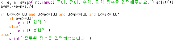 문제) 국,영,수,과 점수를 입력한 후 네과목 평균이 80점 이상이면 합격, 평균 80점 미만이면 불합격을 출력하고, 0점 이상 100점 이하의 점수 범위를 벗어나면 잘못된 점수라고 출력되게 하여라.