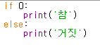 : 정수(2진수, 10진수, 16진수), 실수와 관계없이 0이면 거짓, 0이 아닌 수는 참이다.