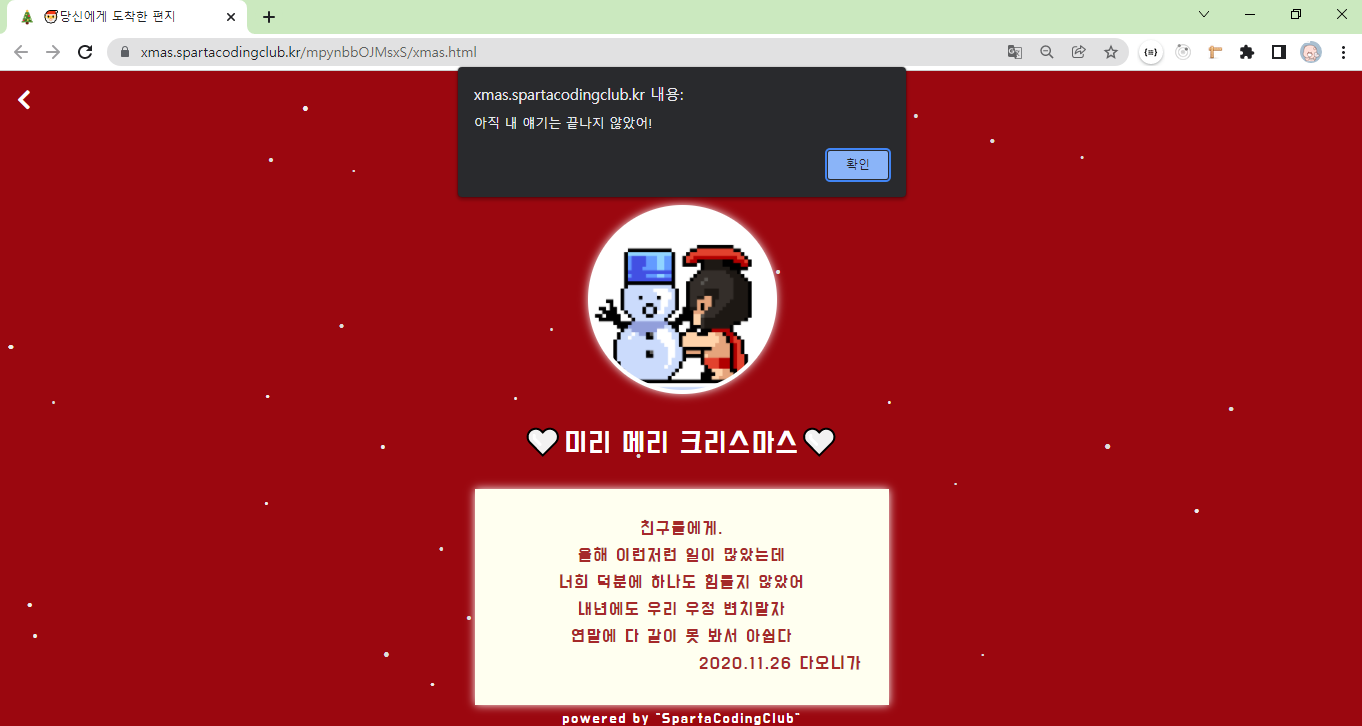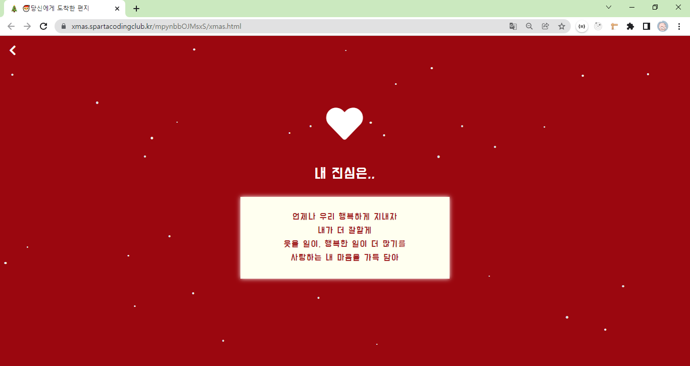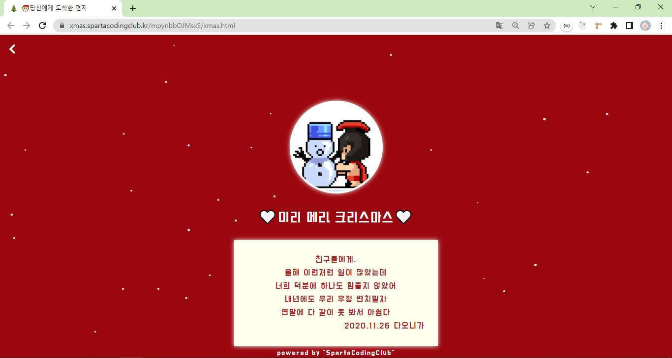 [스파르타코딩클럽 르탄즈 1기] 나홀로코딩-크리스마스 카드를 제작해봤어요! 본문