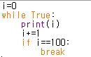 i=0부터 시작하여 값이 1씩 증가하는무한루프인데 i가 100이 되면 break를 통해 루프를 끝내고 while의 제어를 벗어나게 된다.